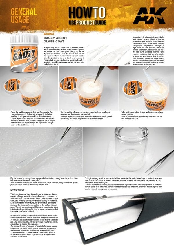 Producto de alta calidad desarrollado para mejorar, reparar y lograr acabados transparentes extremadamente realistas en forma de vidrio en piezas de plástico transparente. Simplemente sumerja y deje secar durante unos minutos. La botella es gruesa para sumergir las piezas sin problema. Limpie el exceso alrededor de los bordes para lograr una capa uniforme. Para mejores resultados, permita que el producto se seque en un ambiente libre de polvo. Este producto, cuando se aplica a plástico transparente, dará como resultado una apariencia realista de vidrio en partes como cubiertas de cabina de plástico transparente u otras partes transparentes.