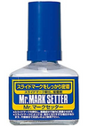 Mr. Mark Setter es un componente adhesivo, que da a las calcas una mayor adherencia a las piezas de plástico. Es mucho más fácil pegar calcomanías en una pieza de modelo de plástico donde las piezas tienen una superficie rugosa o irregular. Primero, se pinta el área en la que se colocará la calcomanía y luego se aplica la calcomanía. Después de eliminar las burbujas de aire presionando la calcomanía con un hisopo de algodón, se aplica una capa de Mr.Mark Setter y se deja secar. Debido a que la calcomanía ahora tiene un mayor grado de adherencia, el plateado adhesivo (la calidad flotante y brillante de las partes transparentes de las calcomanías) se reducirá o eliminará en gran medida, y las calcomanías se pueden pegar firmemente en superficies irregulares.